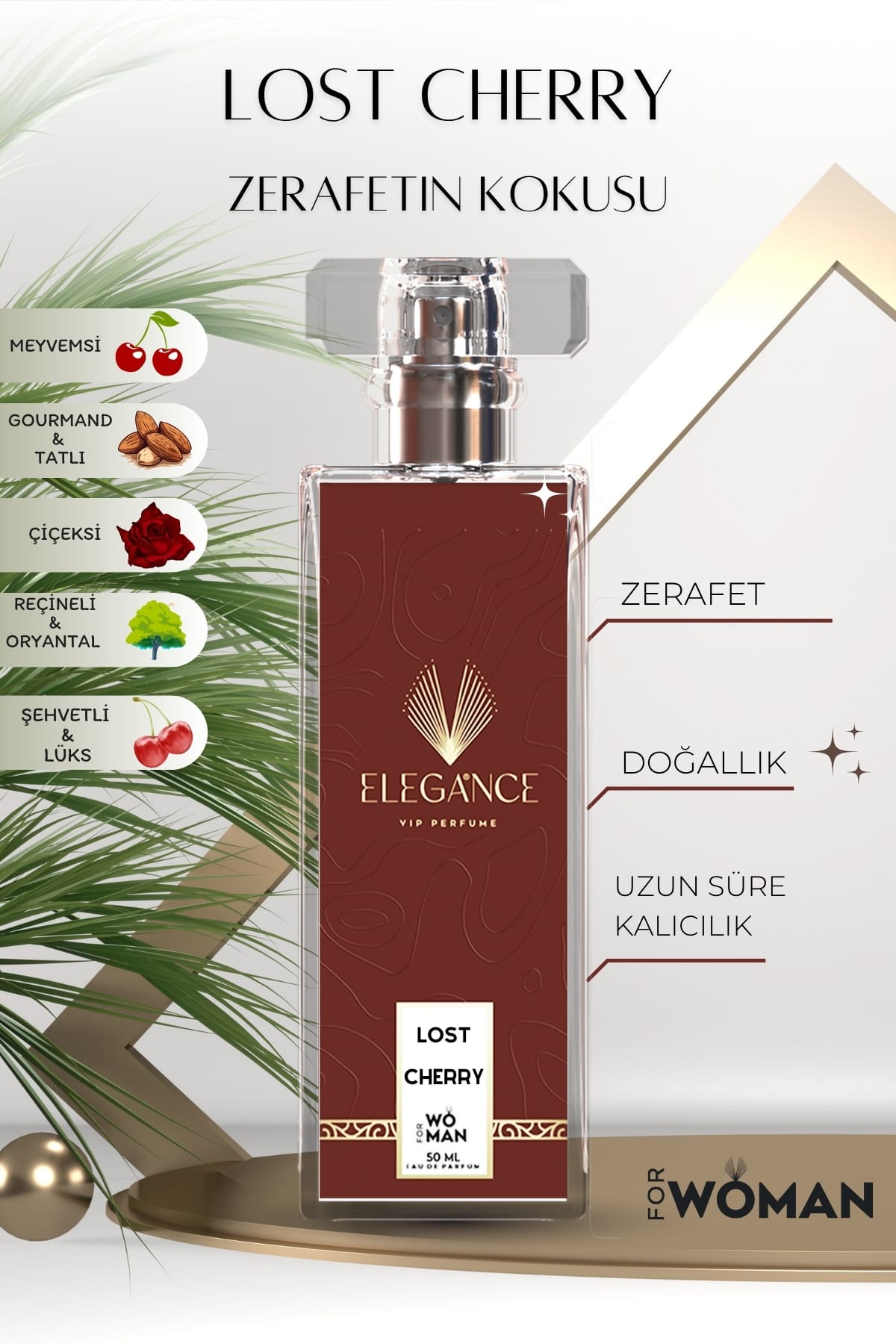 Tutkulu, sıcak ve baştan çıkarıcı… Elegance VIP Perfume Lost Cherry, olgun kiraz ve badem notalarıyla açılıp gül ve yaseminle derinleşen, tatlı ve meyvemsi bir kadın parfümüdür. Vanilya ve tonka fasulyesiyle sarılan bu yoğun koku, zarif ama cesur kadınların imza parfümü olur.
